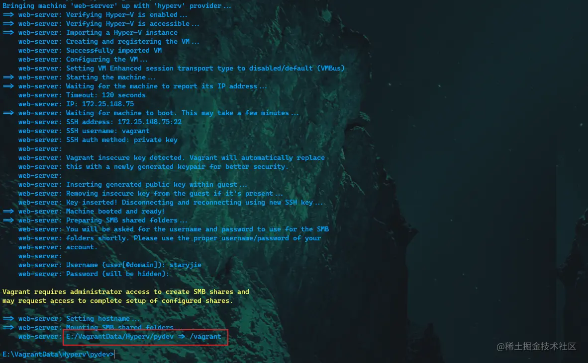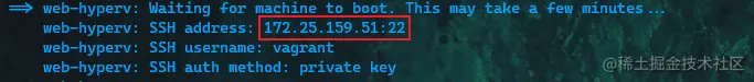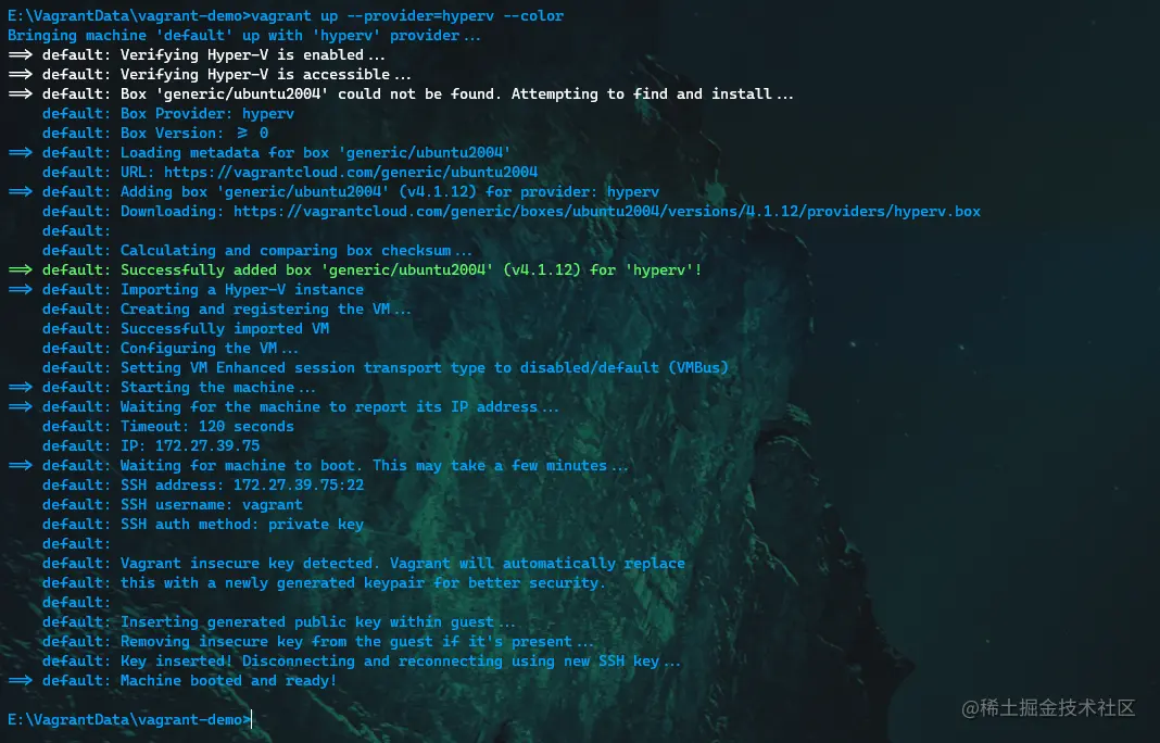 --provider=hypterv:指定通过Hypter-V创建虚拟机--color:日志输出带颜色,更方便查看过程