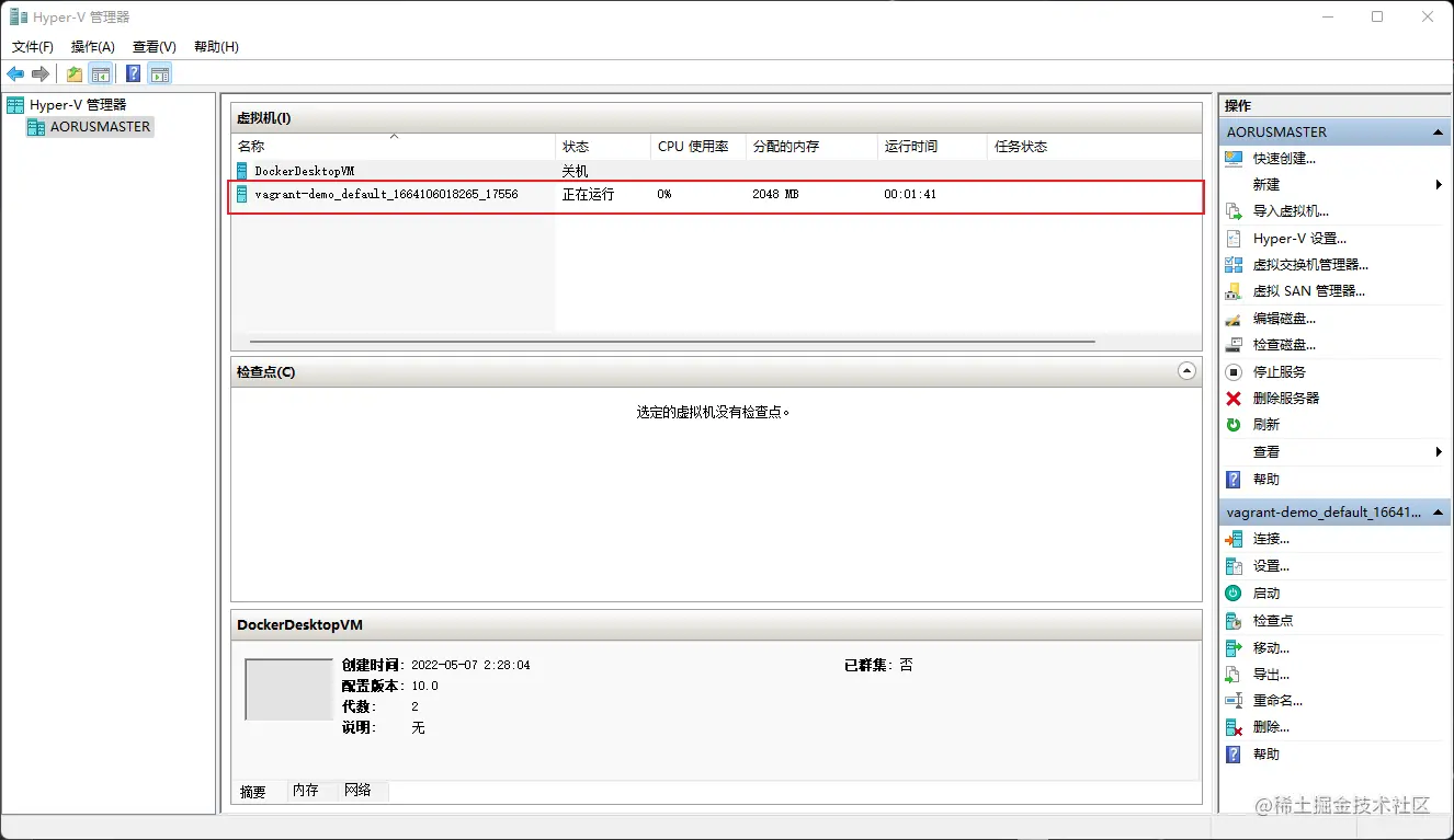 此时打开电脑的Hypter-V管理器就可以看到一台虚拟机正在运行了: