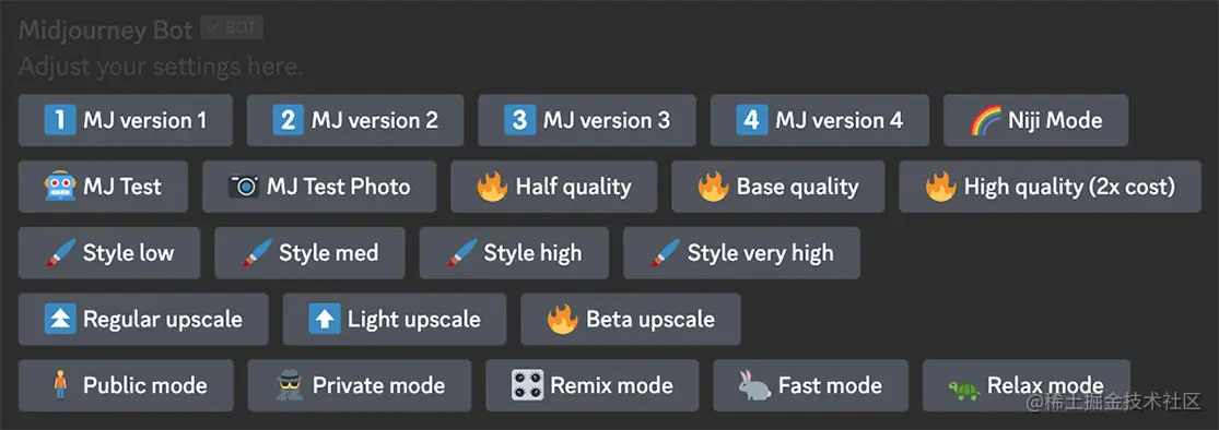 设置命令为模型版本、样式值、质量值和升级器版本等常用选项提供切换按钮。设置也有/stealth和/public命令的切换按钮。
