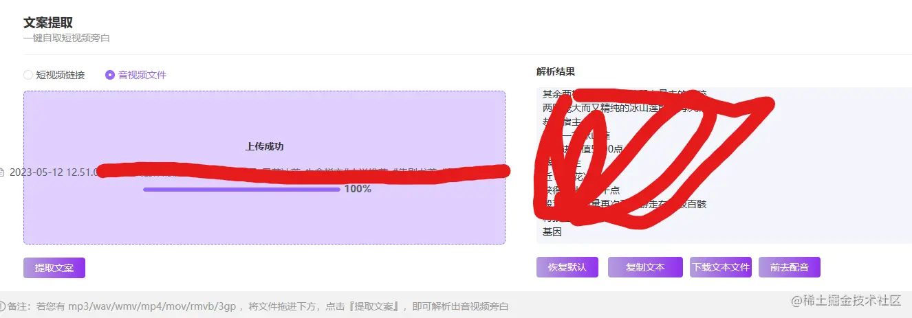把音频上传, 然后点击提取文案即可,