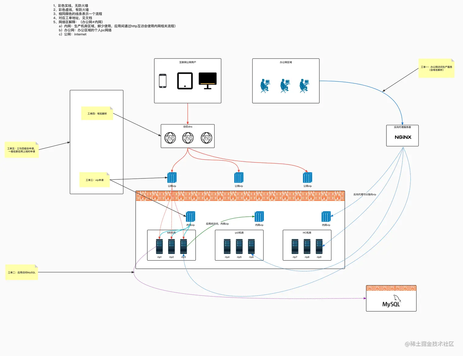 公网: 互联网用户网络,通过DNS + 公网vip 访问内网机房应用