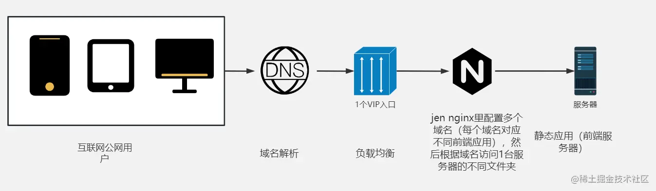 外网访问需满足如下图架构:VIP后面挂 jen-nginx 来代理前端的主应用,jen代理后面挂静态应用1~N