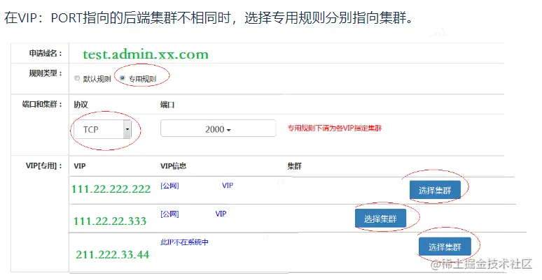专用规则:面向VIP,可为某VIP独立指定后端集群。 其中专用规则优先级高。