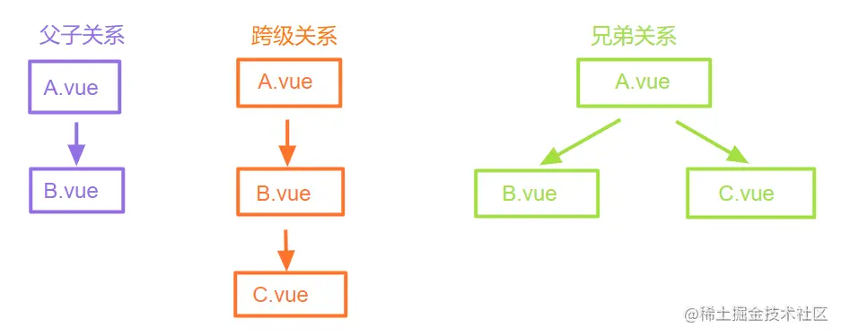 如图所示,组件之间数据通信有父子组件之间通信,跨级组件之间通信以及兄弟组件之间通信三种场景,那这三种场景分别有哪些通信手段呢?