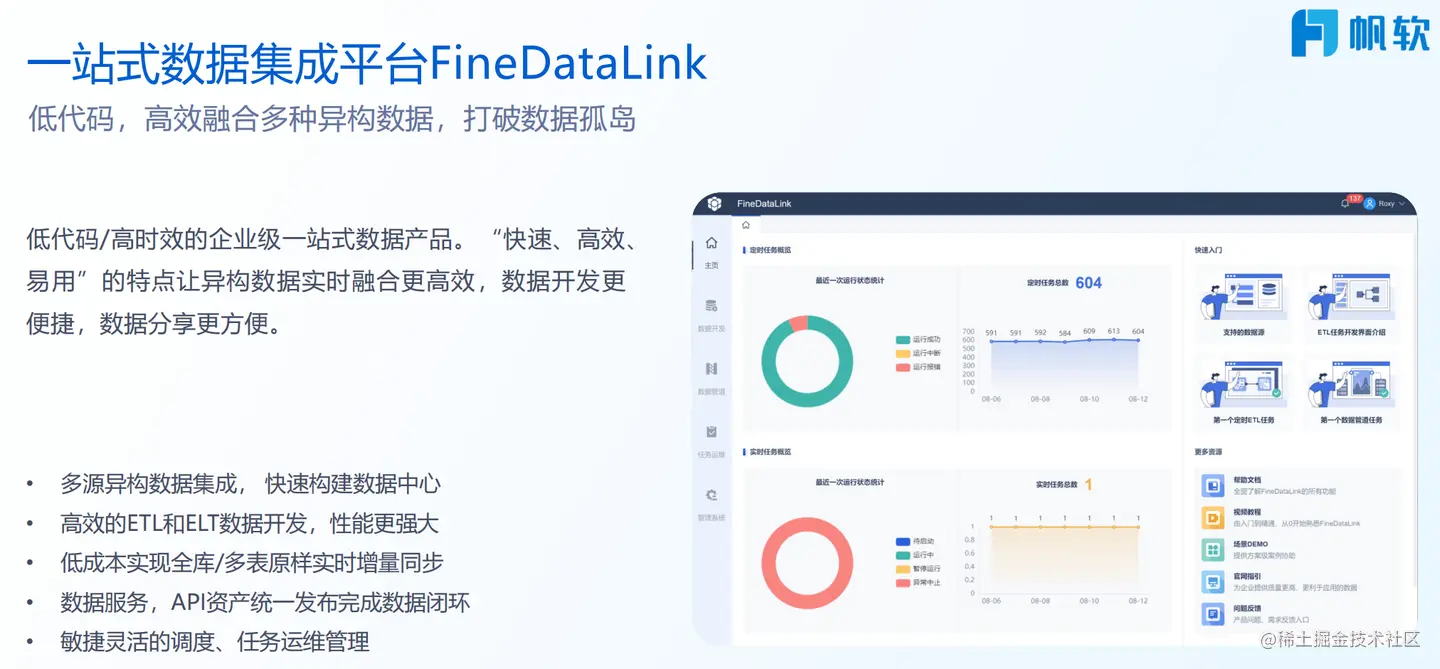 在ETL环节,帆软一如既往使用全家桶模式,有专门的工具FineDataLink,提供一站式数据处理平台,可以说是专为IT准备了数据开发处理模块,支持数据同步、数据转换,对比删除、数据关联、行列转换、json解析、SQL脚本、条件分支、循环容器等专业数据处理操作。本质上,帆软认为数据处理应该交给IT,而数据编辑分析可以交给业务自己完成。