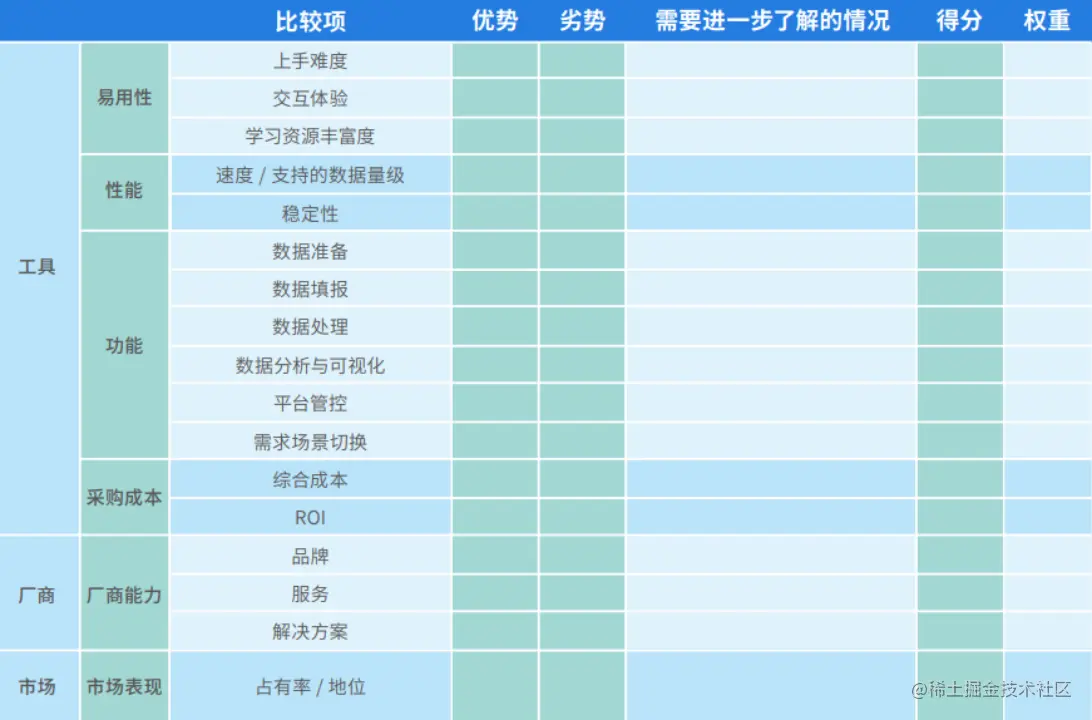 最后给大家分享一张BI工具选型评分表,企业根据自由情况去对上述因素进行对比,根据评估维度打分后再按照权重计算总分。