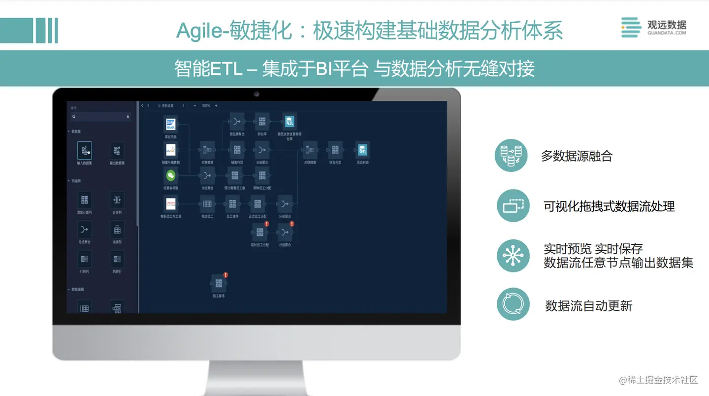 其实对大多数人来说,数据分析的习惯都是来自于Excel,Fine BI延续帆软的报表工具FineReport,使用的也是类Excel的操作界面,而观远的smartETL算子不多,看起来很简单,在实际处理数据的过程中可能需要大量的操作,业务实际用起来还是有难度的。