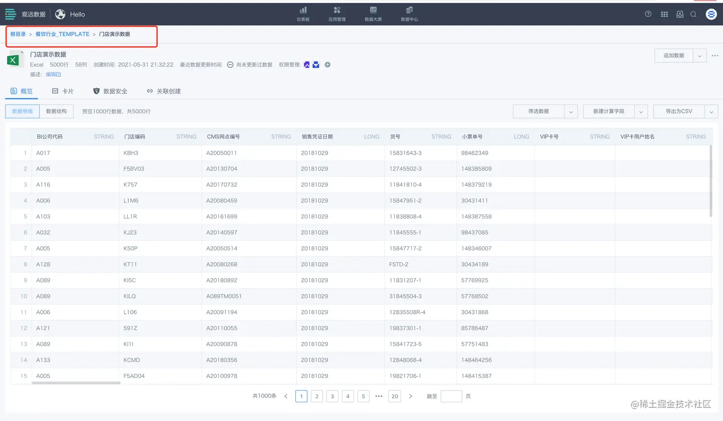 在观远BI里面,我只需要点击三下,页面就层层递进找到门店数据表,这就是观远BI的易用性体现。但注意一下这个操作的前提:我知道表的完整名称,也明确表中字段有哪些。