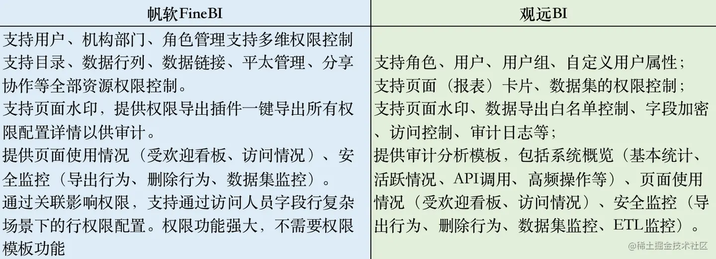 权限管控是平时采购比较关注的点,我这边整理了相关权限管控的功能,大家对比的时候可以细看。这里提两个我注意到的问题, 帆软的权限不支持模板直接复用,而是通过表之间的联动来复用权限,这跟我们平时的使用习惯有些出入。而观远的行权限管控需要用到sql,层级越多sql越复杂,公司架构比较复杂的情况下就很难受了。