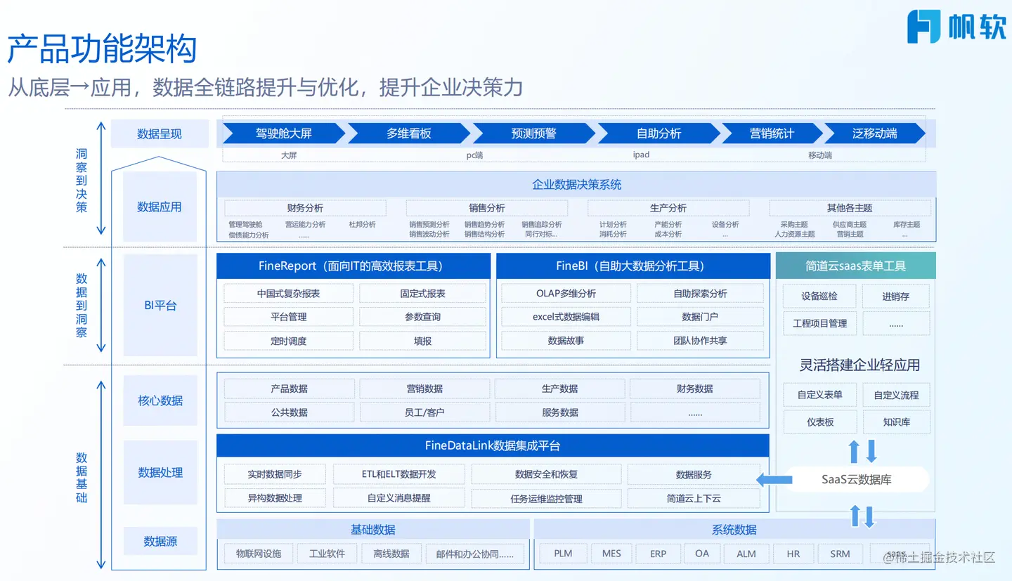 除此以外,Fine BI能够制作可视化仪表盘,但不具备可视化大屏功能(通常用FineReport实现),也不具备复杂报表功能(通常用FineReport实现)。所以,一般情况下,公司采购帆软产品都是FR+BI的形式。