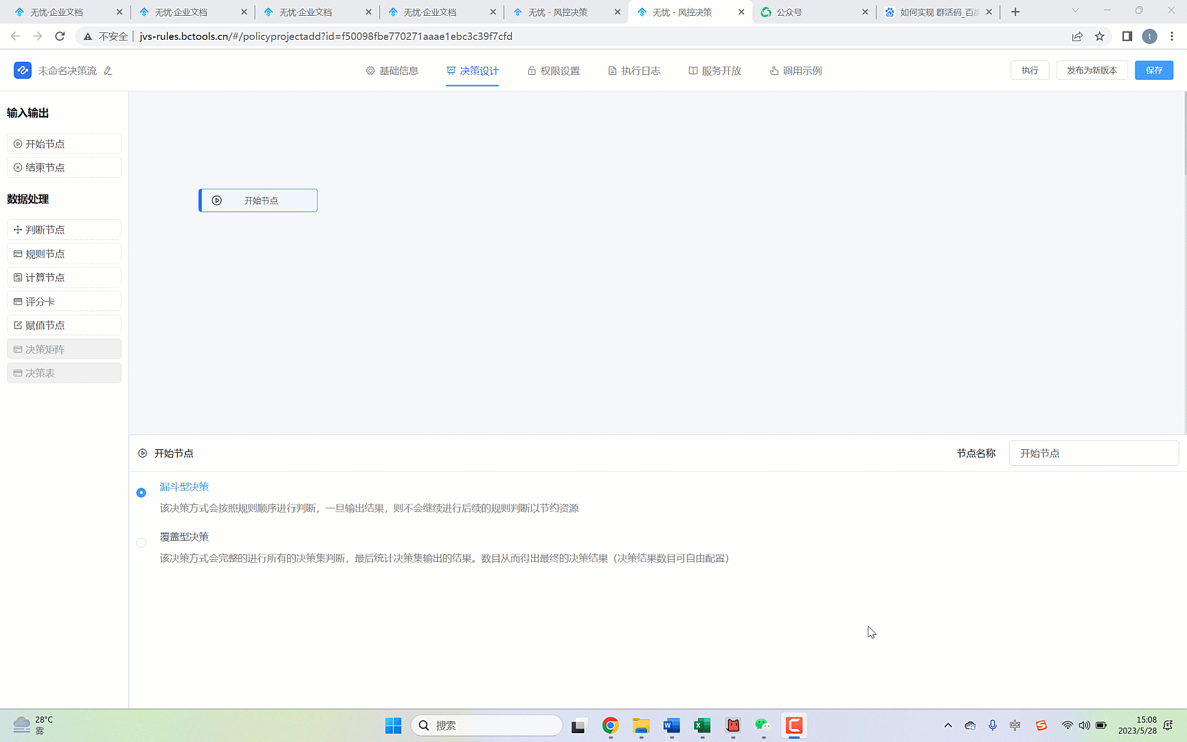 决策流:决策流是由多个业务节点连接而成的流程,用于实现复杂的业务逻辑。决策流中的业务节点按照特定的顺序执行,每个节点根据输入数据和规则引擎的执行结果,决定下一个要执行的节点。决策流的构建可以基于业务需求和流程图进行设计和拼装。