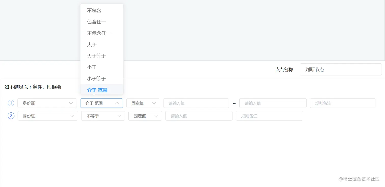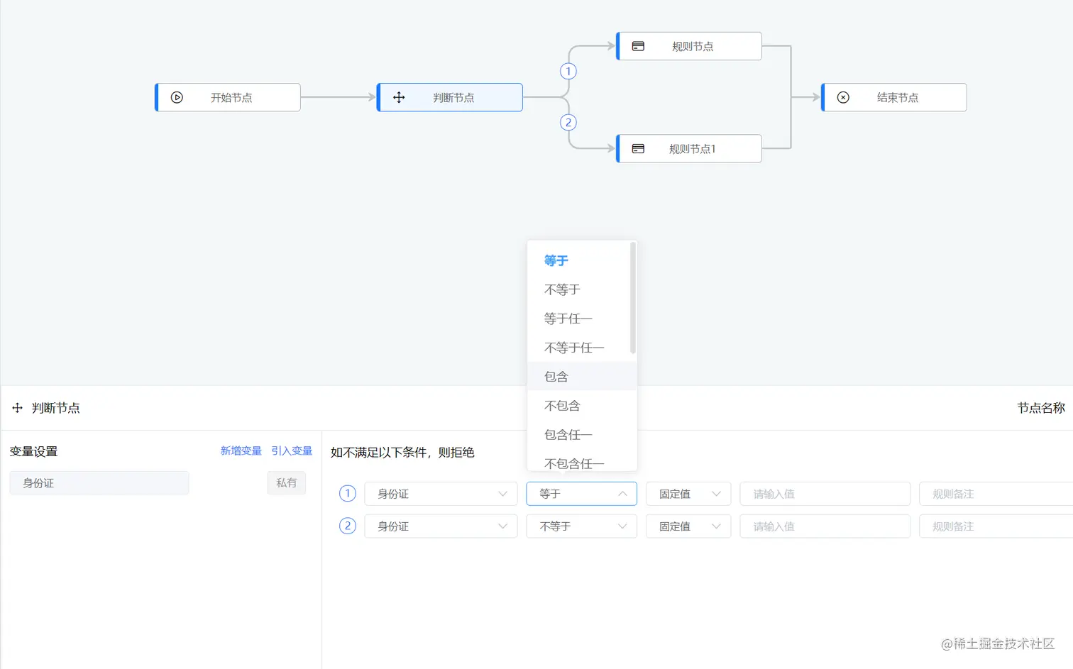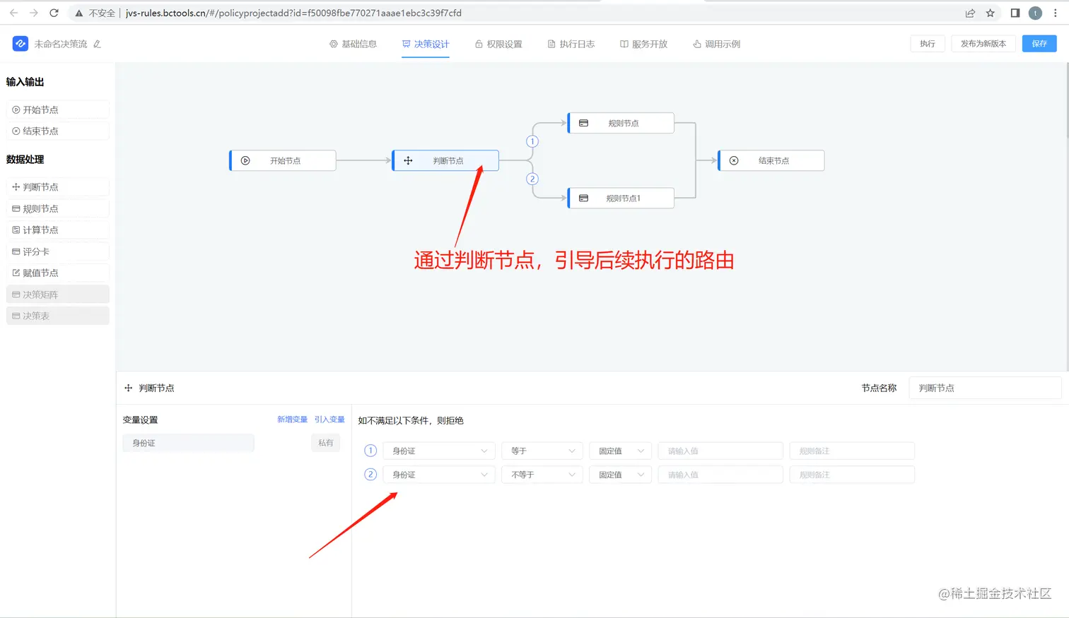 判断节点通常由一个或多个条件组成,这些条件可以是简单的逻辑表达式、比较操作符、函数调用或者其他规则引擎所支持的表达式。判断节点将评估这些条件,并基于评估结果决定下一步的操作。