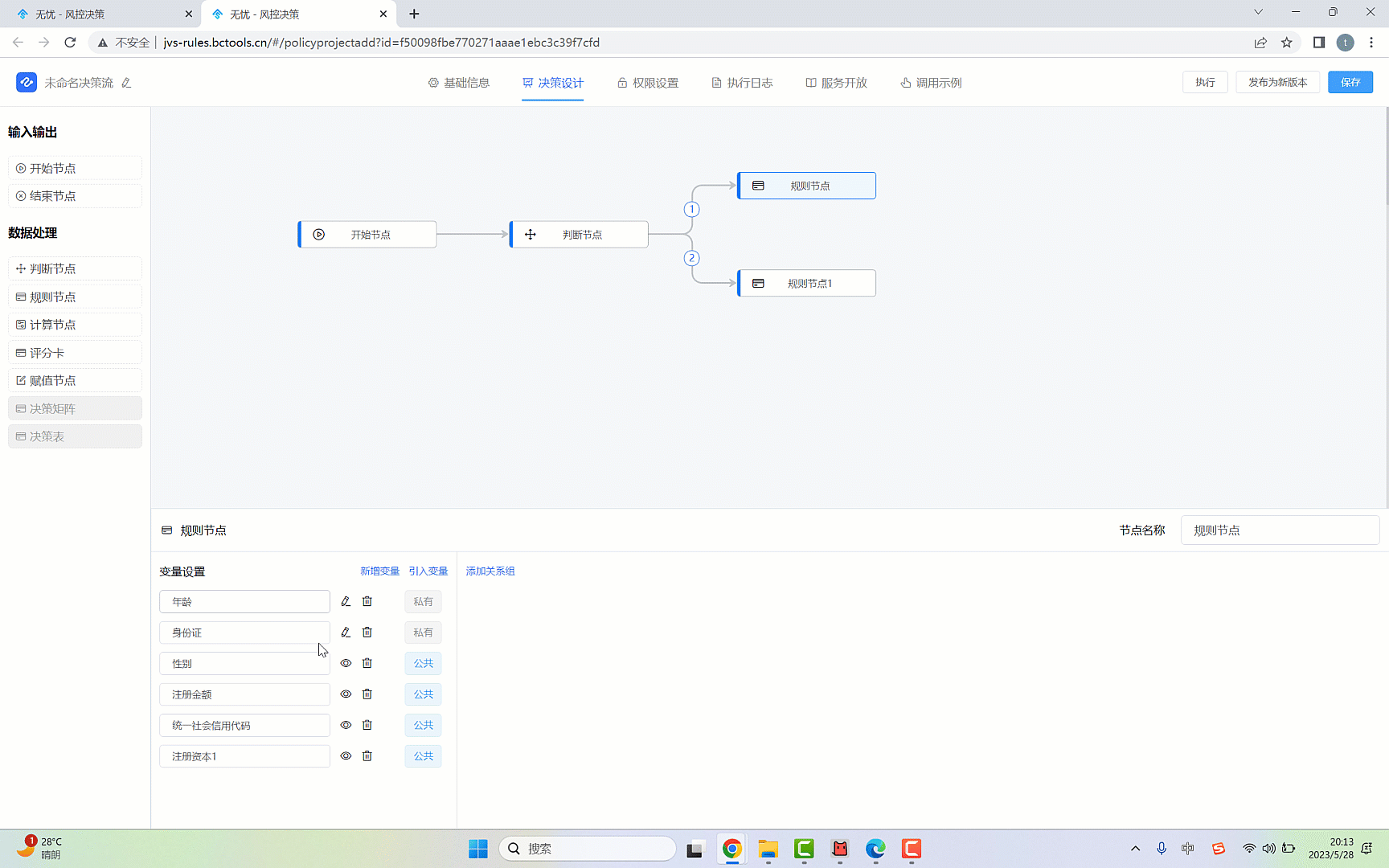 选择对应规则配置节点,可以选择新增变量,也可以点击引入变量,这里的新增变量是基于本决策流生成的私有变量,引入的变量是可以引入公有变量和本决策流的其他私有变量。