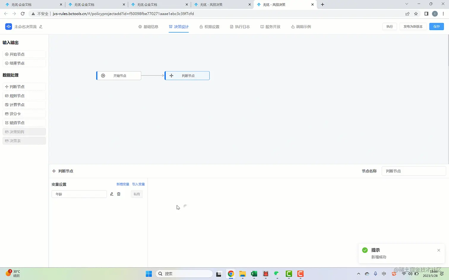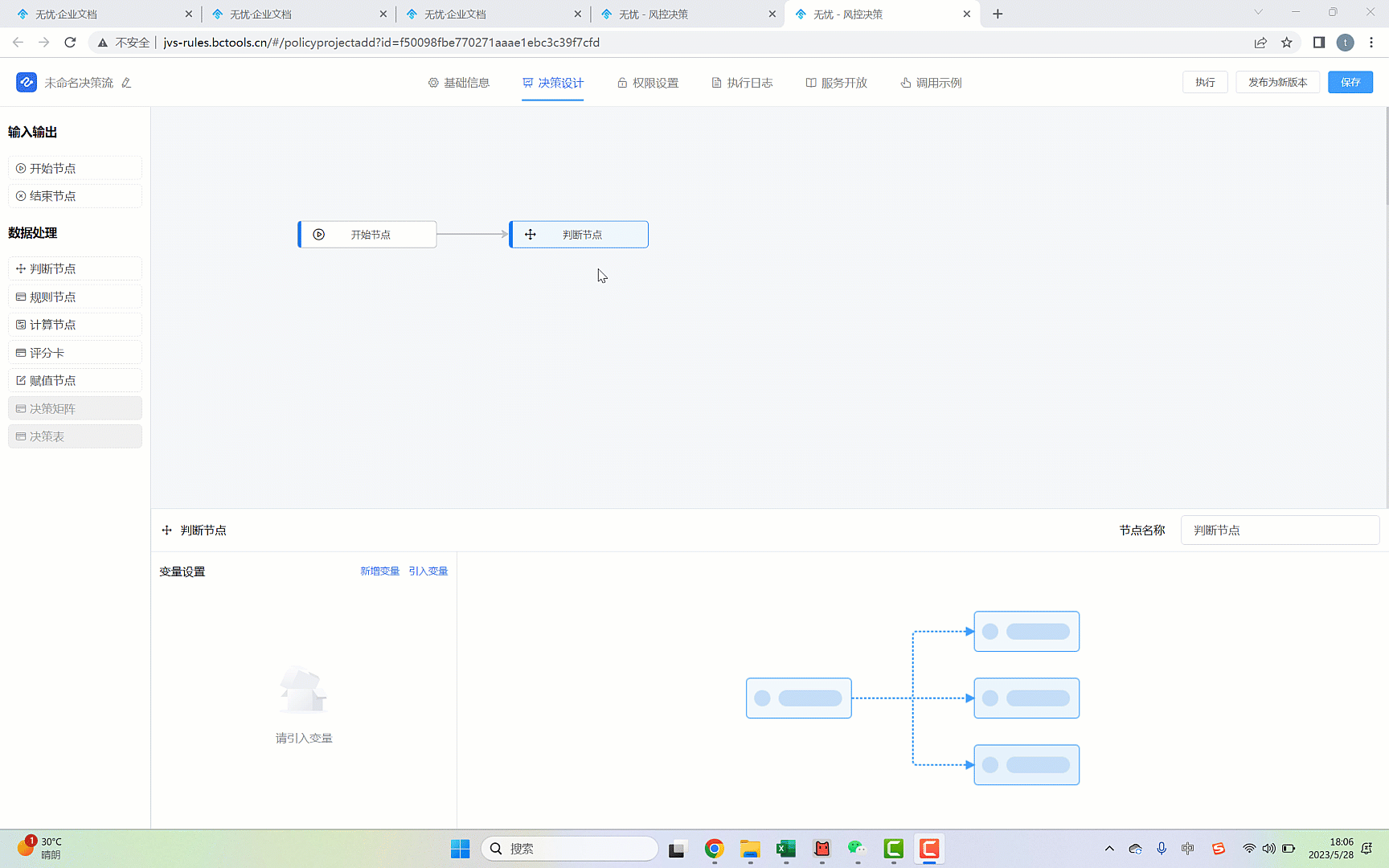1、拖入判断节点,链接决策流开始节点或者上游节点