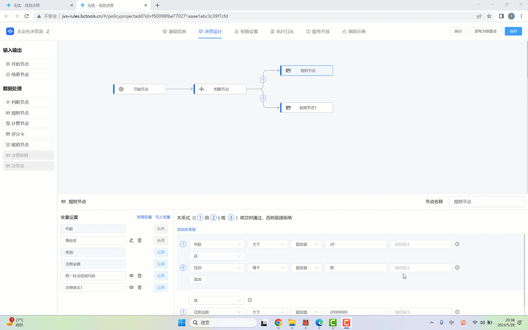 决策流的构建可以基于业务需求和流程图进行设计和拼装。通过可视化编辑器或编程接口,规则引擎的用户可以定义业务节点、规则之间的依赖关系和执行顺序。这种可视化的方式使得规则引擎的配置和管理更加直观和易于理解。 规则引擎的用户可以根据具体的业务需求灵活地设计和调整决策流,以适应不同的场景和变化。这种模块化和可配置的特性使得规则引擎能够提高系统的灵活性、可维护性和可扩展性。