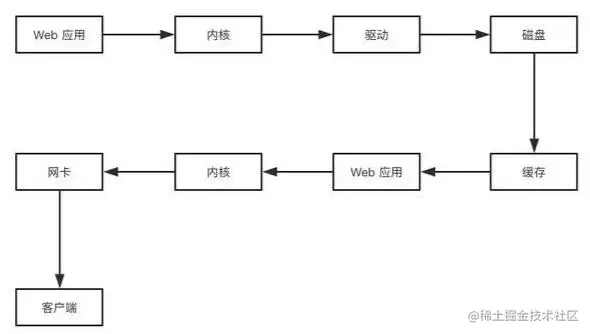 如下图,Web 应用要返回数据,首先要获取数据,通过内核调用磁盘的驱动程序,把数据读入缓存,这样就可以在 Web 应用程序中获取数据并进行数据处理,最终调用内核,将数据通过网卡发送给客户端。
