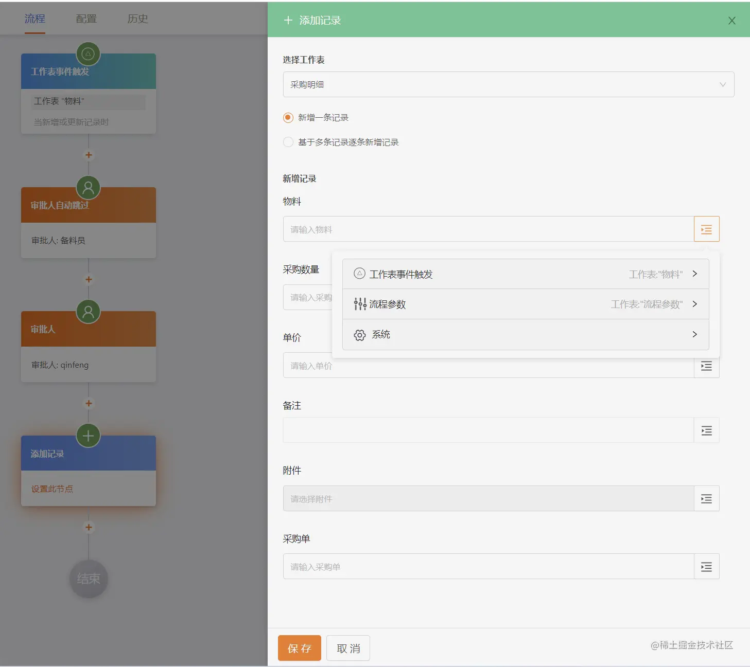 你应该也看到了,他还有:添加记录、更新记录、删除记录、查询记录、更新流程参数等数据节点,这个是通过流程来实现数据的串联修改功能。 你可以通过流程实现,修改一个表单的同时,变更或者删除另外一个或者多个表单,是不是很强大啊!!