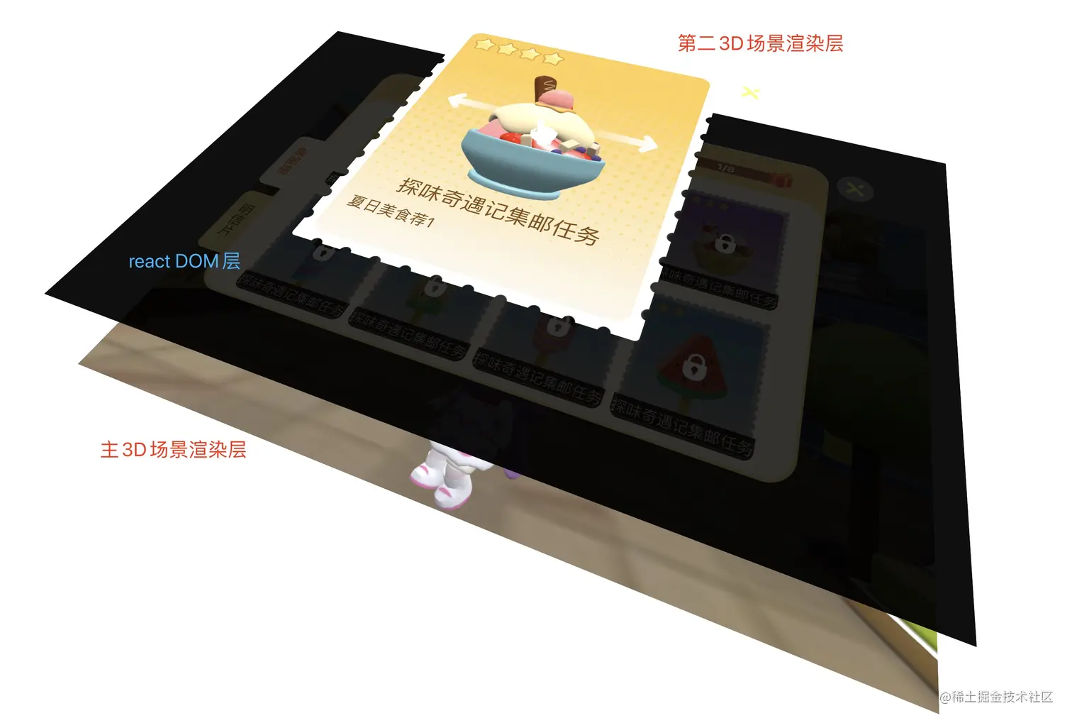 1.3D 场景层顾名思义渲染 3D 场景,由 人物模型、建筑模型和宝箱这些互动模型组成
