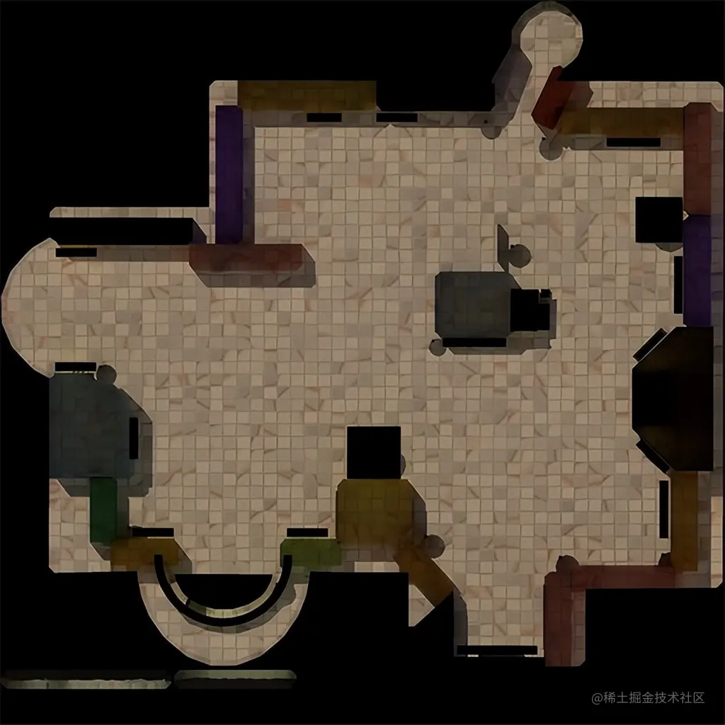 跟设计侧交流后,决定在地板的贴图纹理上预先加上建筑的投影。这种方法对大部分是固定模型的场景能有较好的效果,而人物的阴影可以用静态图片跟随模型移动模拟。