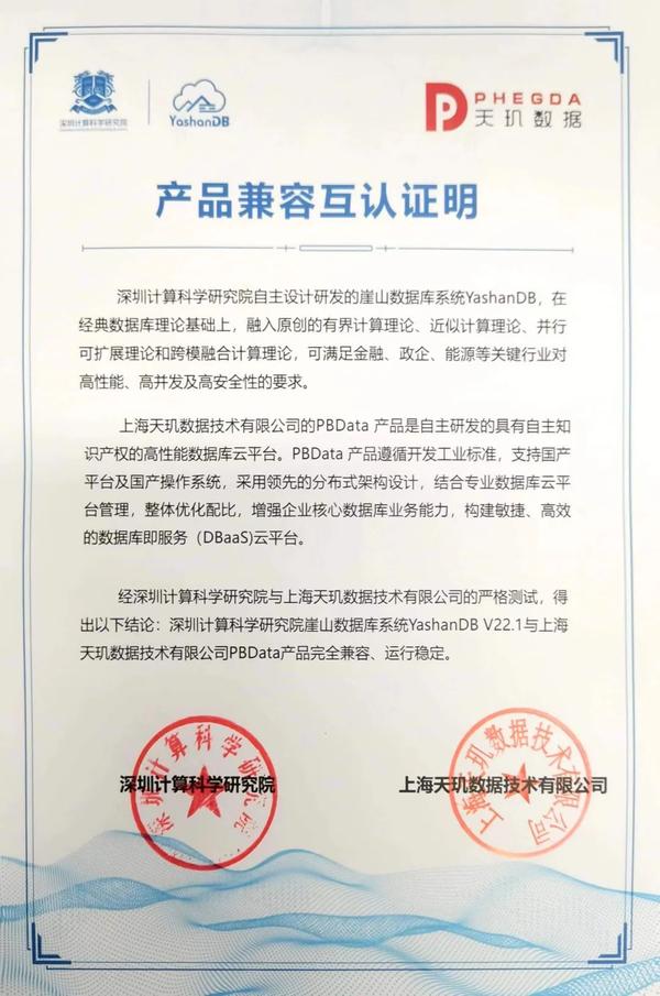 近日,深圳计算科学研究院崖山数据库系统YashanDB V22.1与上海天玑数据技术有限公司PBData产品完成兼容性互认证。经严格测试,双方产品完全兼容、运行稳定。