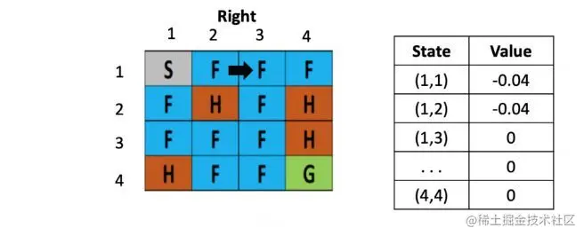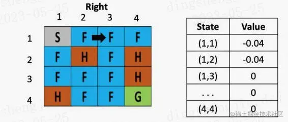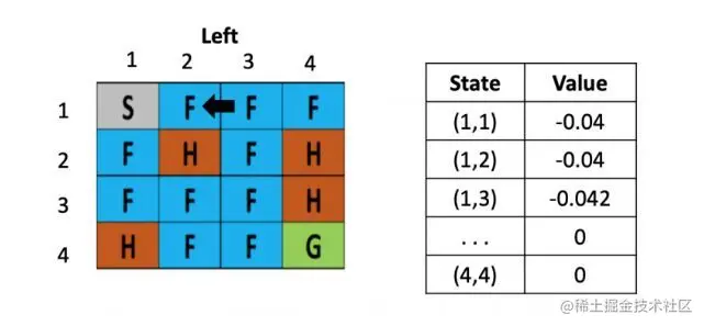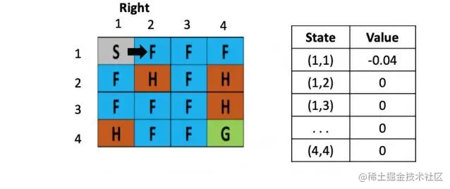 左图是每个位置对应的Q value的表,最初都是0,一开始的策略就是随机生成的,假定第一步是向右,那根据上文公式,假定学习率是是 0.1,折现率是0.5,而每走一步,会带来-0.4的奖励,那么(1.2)的Q value就是 0 + 0.1 ×[ -0.4 + 0.5× (0)-0] = -0.04,为了简化问题,此处这里没有假设湖面有风。
