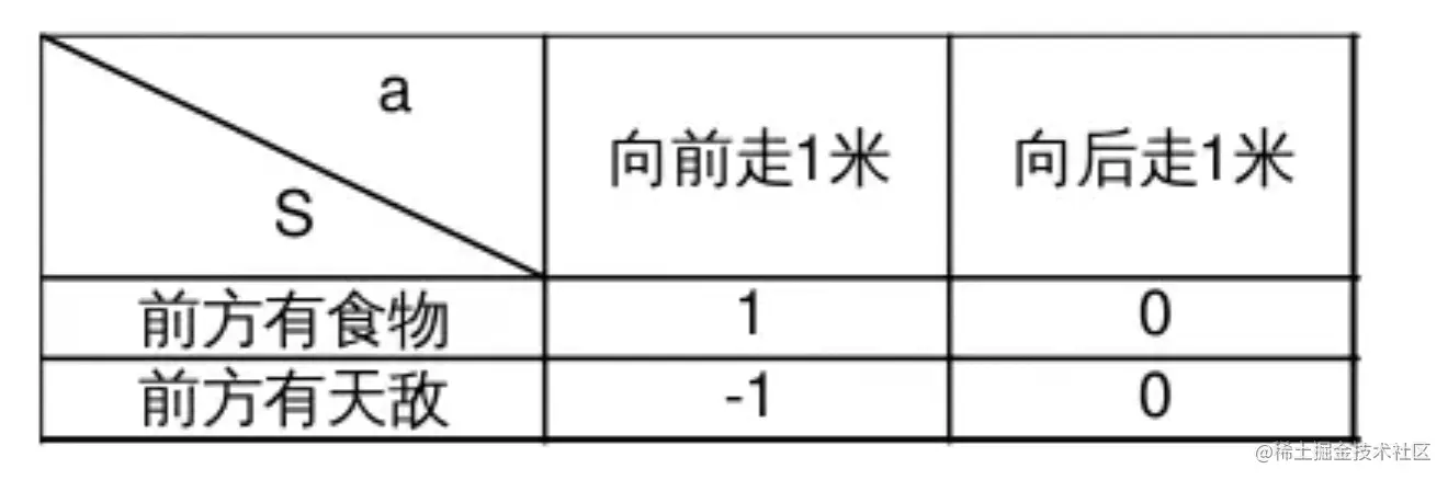 显然,如果此时S="前方有食物",选择a="向前走1米",得到的利益Q="1" 显然比选择a="向后走1米" 的q="0"要大,所以这时应该选择向前走;相对的前方如果有天敌,往前走显然没有任何利益,这时选择最大的利益就要向后走。这种表格在Q-Learning中被称为Q表,表中的S和a需要事先确定,表格主体的数据——q在初始化的时候被随机设置,在后续通过训练得到矫正。
