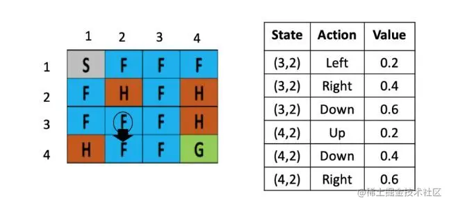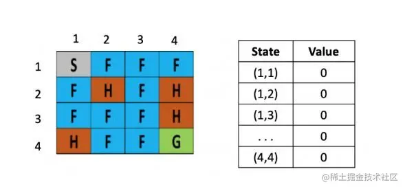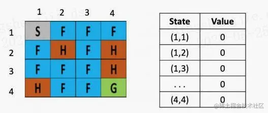 将一个结冰的湖看成是一个4×4的方格,每个格子可以是起始块(S),目标块(G)、冻结块(F)或者危险块(H),目标是通过上下左右的移动,找出能最快从起始块到目标块的最短路径来,同时避免走到危险块上,(走到危险块就意味着游戏结束)为了引入随机性的影响,还可以假设有风吹过,会随机的让你向一个方向漂移。