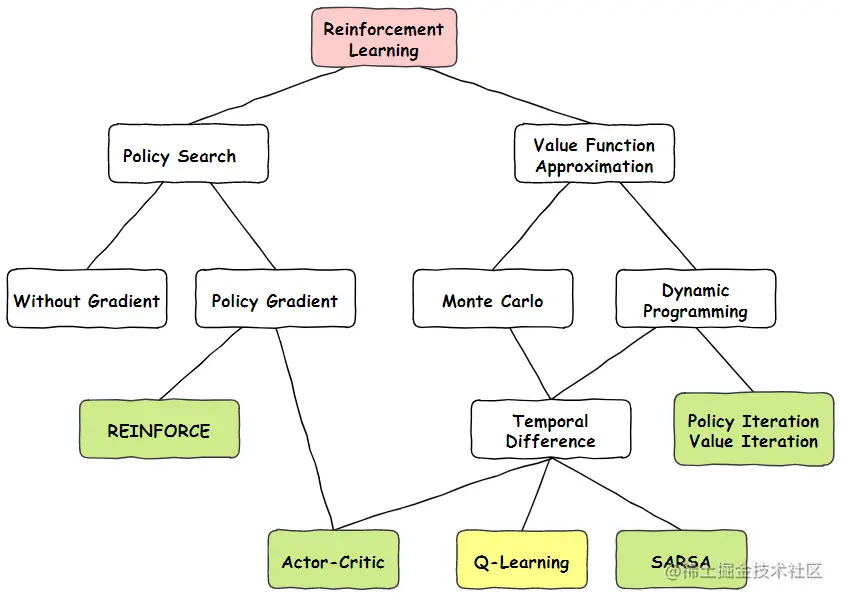 首先我们看一下上图Q-learning在整个强化学习的位置,Q-Learning是属于值函数近似算法中,蒙特卡洛方法和时间差分法相结合的算法。它在1989年被Watkins提出,可以说一出生就给强化学习带来了重要的突破。