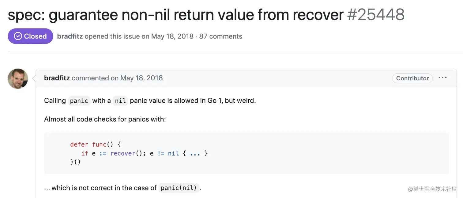 这在 2018 年由 Go 的核心成员@ Brad Fitzpatrick 提出了《spec: guarantee non-nil return value from recover》期望得到解决。