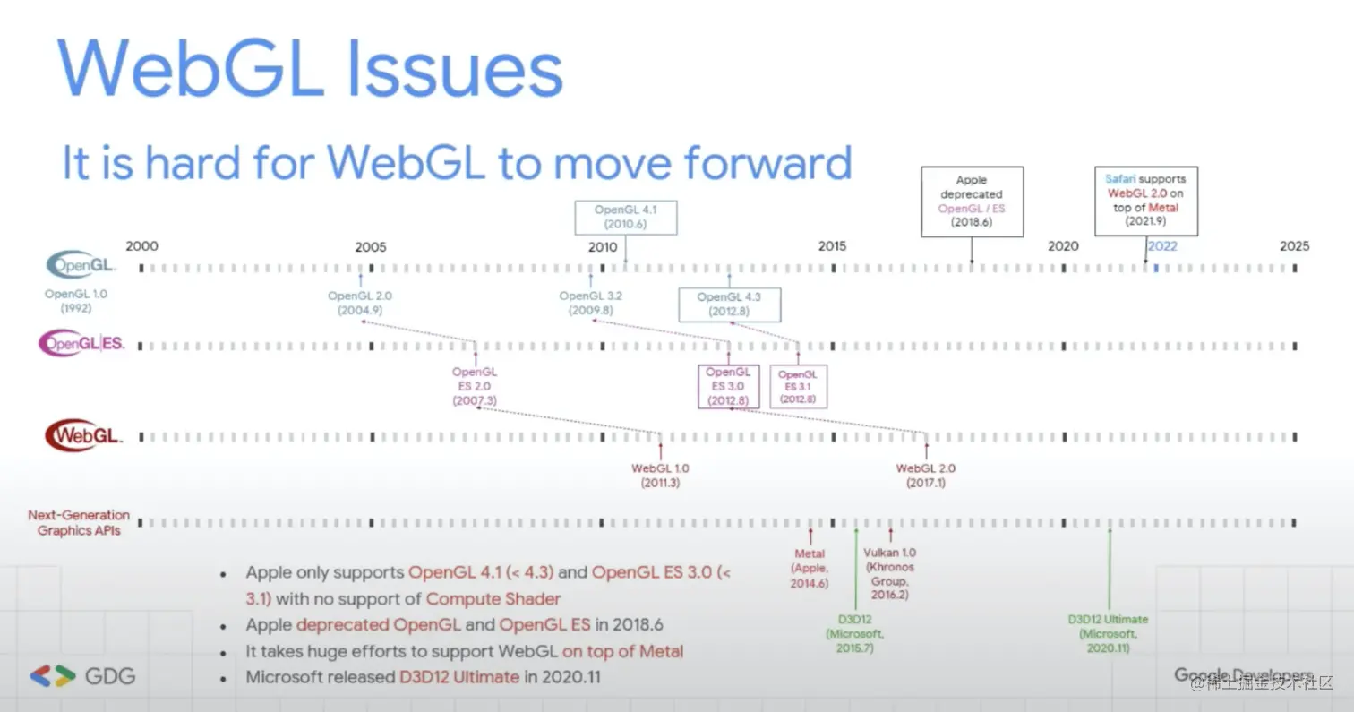 WebGL 的 API 适应早期的 GPU 架构,没有函数编写能力,主要是一组状态机,用户通过传递参数来配置,实现一些规定的逻辑功能。而现在的 GPU 能力很强大,具备可编程能力,用户可以实现自定义的算法。