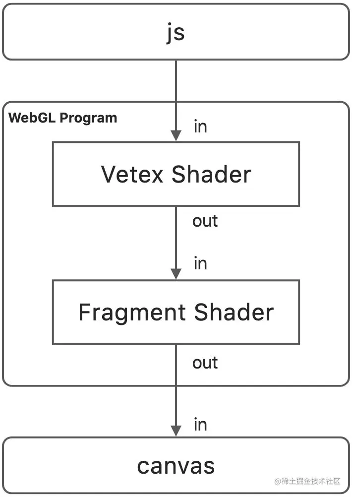 WebGL 最终运行在 GPU 上,代码用 GLSL 语言(图形库着色器语言)编写,主要由两部分组成,分别是顶点着色器(Vetex Shader)和片段着色器(Fragment Shader),两者组合起来成为一个程序(Program)。
