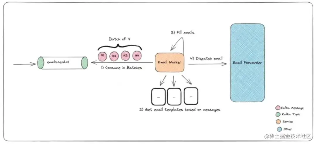 我们会监听事件,从他们的注册表中检索电子邮件的模板,丰富它,并将其发送给客户。然而,我们开始遇到负载问题:团队开始看到生产率出现峰值,导致消费滞后并影响重要的 OTP 消息和 SLO。