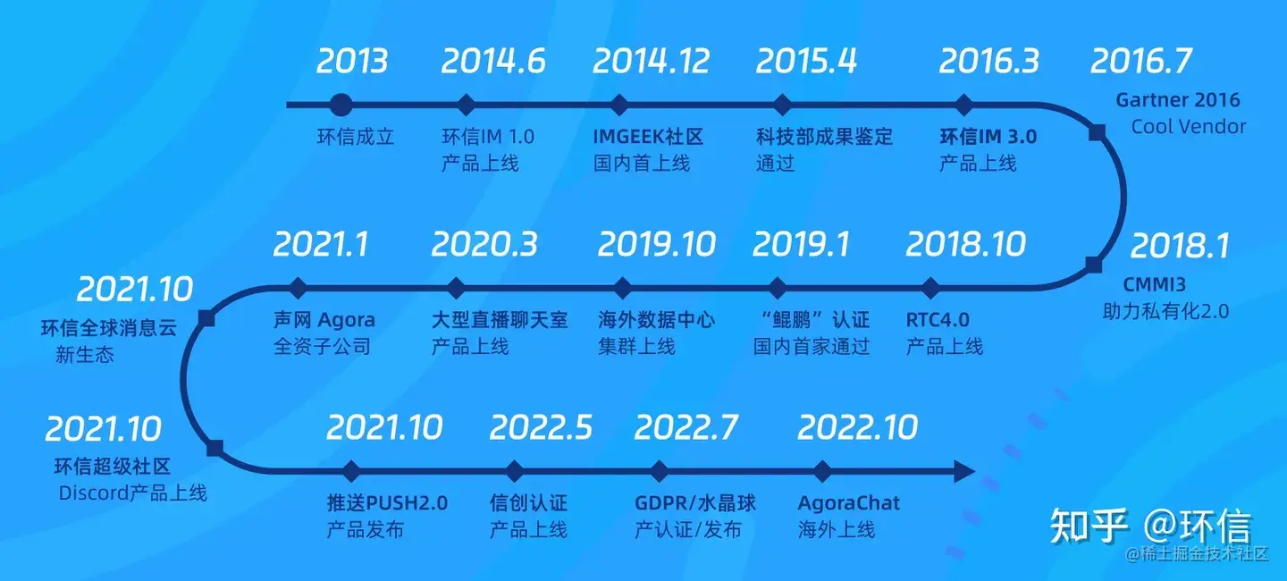 环信从13年开始创业,从车库咖啡开发app开始,到14年5月发布即时通讯云,15年搬到数码大厦开始IM PaaS和客服SaaS双领域发展。创业十年,我们开创了即时通讯云领域,持续服务广大开发者,一路走来我们引领了诸多行业创新。