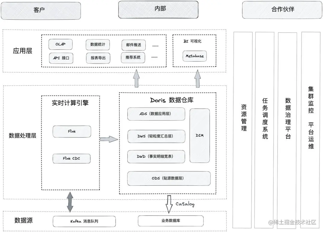 在新的架构中我们采取 腾讯云数据仓库 Doris 和 腾讯云EMR-Flink 来构建实时数仓,多种数据源的数据经过 Flink CDC 或 Flink 加工处理后,入库到 Kafka 和 Doris 中,最终由 Doris 提供统一的查询服务。在数据同步上,一般通过 Flink CDC 将 RDS 数据实时同步到 Doris,通过 Flink 将 Kafka 的日志数据加工处理到 Doris,重要的指标数据一般由 Flink 计算,再经过 Kafka 分层处理写入到 Doris 中。