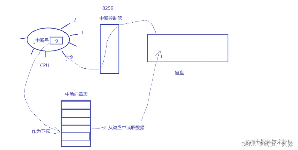 操作系统内维护一张中断向量表 中断向量表内部包含函数指针 中断号作为中断向量表的下标,直接调用中断向量表中对应的方法 而这个方法会从键盘中读取数据