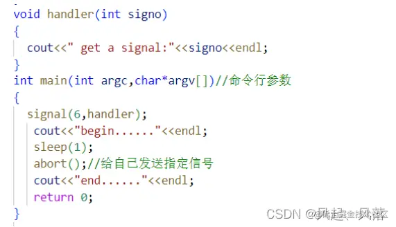 第二个是一个函数指针 将 void(*) (int) typedef 命名为 sighandler_t signal 函数的第一个参数 是 signsum 代表信号编号 第二个参数 是 handler 代表哪一个进程调用了signal,使指定信号不在执行默认动作,而是执行该函数指针指向的方法