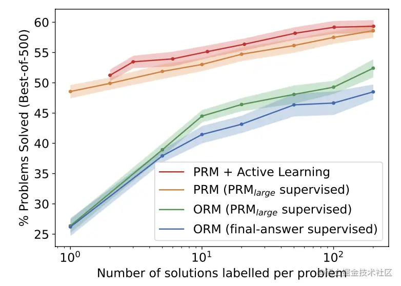 可以通过主动学习,加速学习过程。下图横轴代表每道题的标注数据规模,等价于训练数据规模。主动学习的方式为,使用较小的PRM模型,对每道题保留部分分值最高的负样本。该方法可以提高2.6倍的收敛速度。