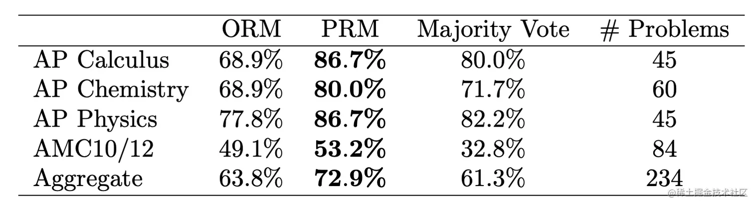 针对过程的PRMs可以较好地泛化到领域外的数据上。可以看到,在各学科的AP数据上,PRMs都取得了较好的表现。