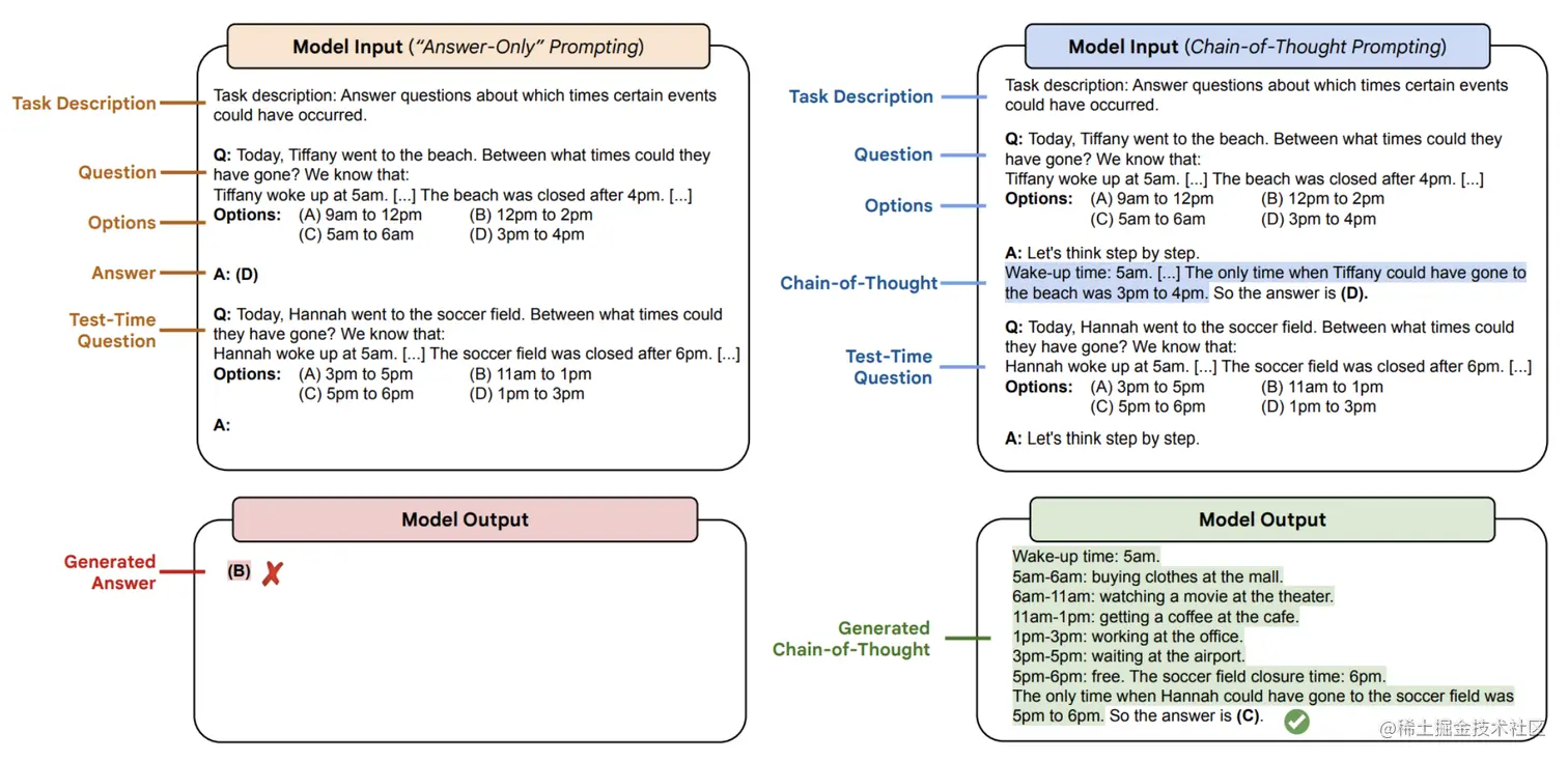 对于ChatGPT等大语言模型,有一个魔法词叫做“let's think step by step”。如下图左所示,在解题等需要复杂推理的场景下,通过这个魔法词,让模型输出答案之前,输出推理过程,有助于提高答案的准确性与可解释性。该方法被称为思维链(CoT,Chain of Thought)。
