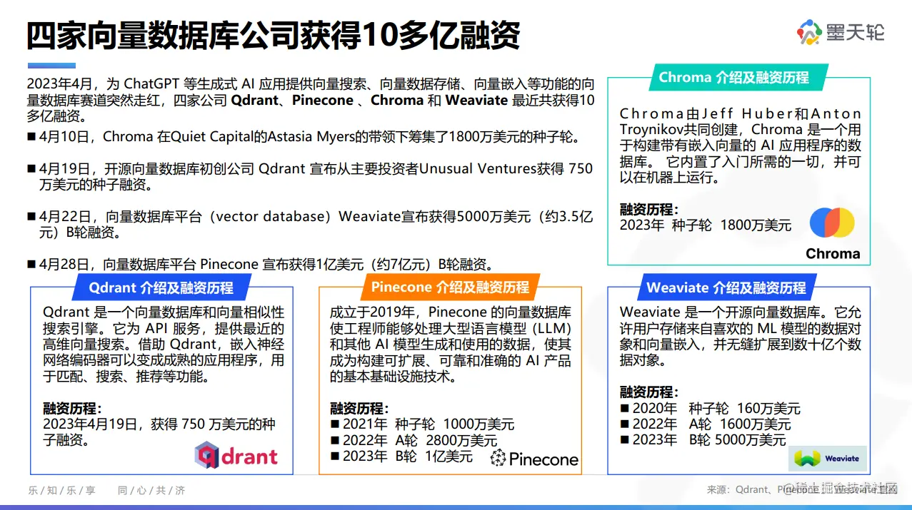 报告整理了近期业内较受关注的投融资、上市等资讯,如航天软件首次公开发行股票并在上交所科创板上市的申请顺利获得证监会注册批复,此前其预计将1.52亿元用于神通数据库系列产品研发升级建设项目;4月,四家向量数据库公司(Qdrant、Pinecone、Chroma 和 Weaviate)最近共获得10多亿融资。此外,还盘点了业界中标、新品发布及活动大会等热点动态,如 TDSQL、TiDB、GoldenDB 联合中标中国建行发布的《国产数据库-小机下移竞争部分》项目,中标金额合计3436万元;时序数据库 InfluxDB 发布3.0版本等。此处因篇幅所限仅截选部分内容,具体内容可查阅报告。