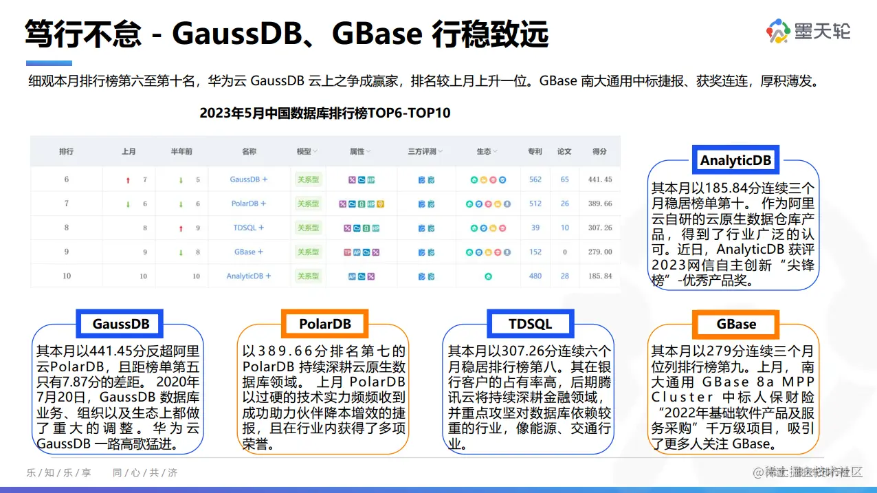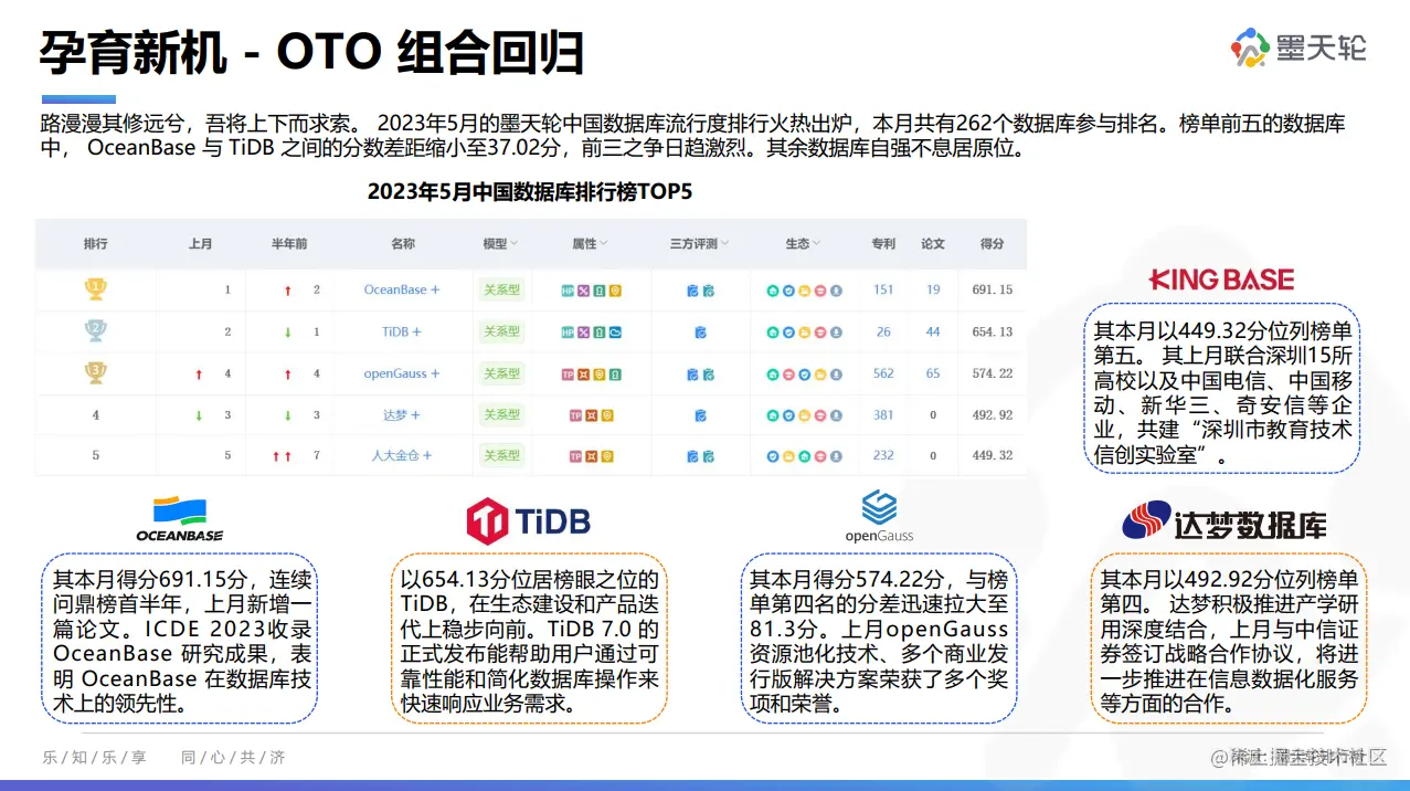 2023年5月的墨天轮中国数据库流行度排行榜共262个数据库参与排名,榜单前十用一句话可以概括为:openGauss 立足创新夺探花;华为云 GaussDB 云上之争成赢家;其余数据库自强不息居原位。在本月排行榜前三中,开源数据库 OTO 组合(OceanBase、TiDB 和 openGauss)重聚,openGauss 较上月提升一名。此外华为云 GaussDB 排名上升至第六位。