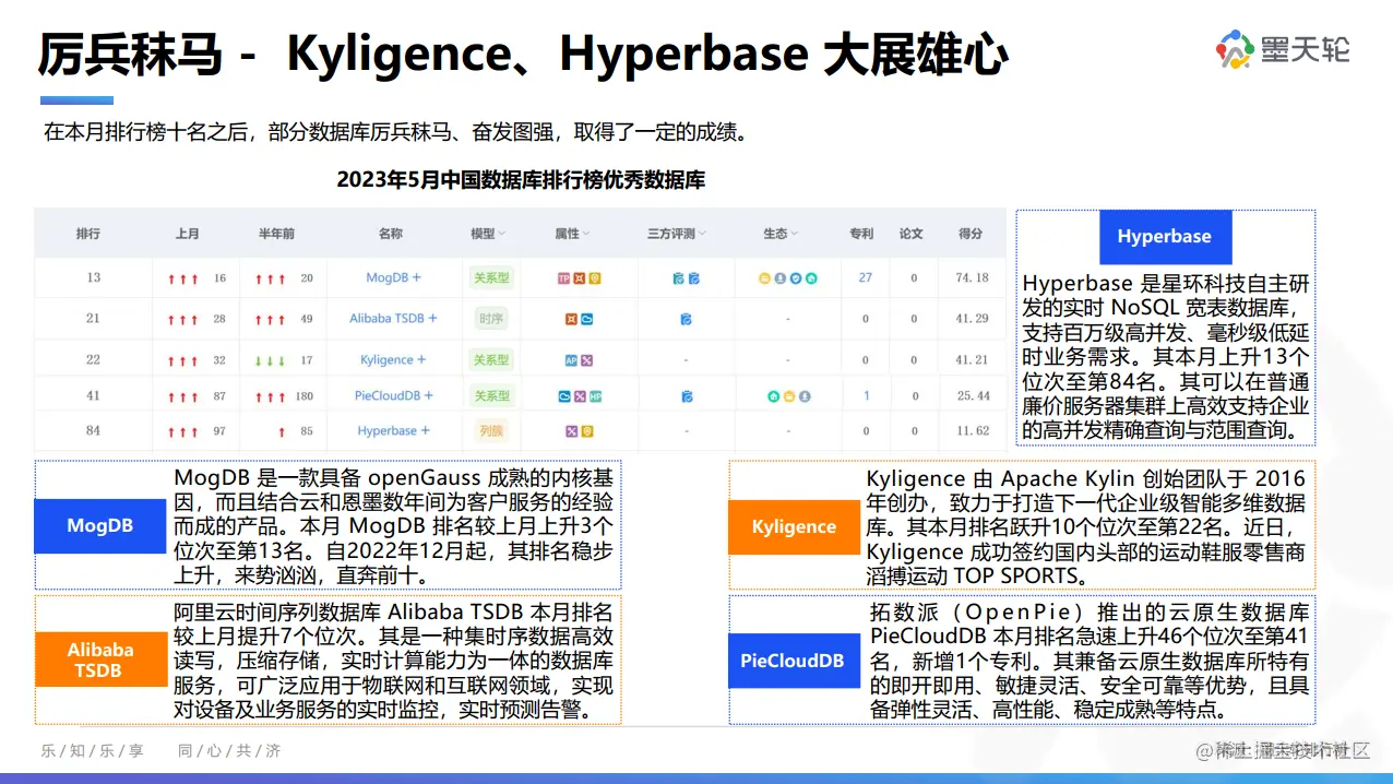 本月排行榜十名之后,部分数据库厉兵秣马、奋发图强,取得了一定的成绩。诸如云和恩墨推出的企业级关系型数据库 MogDB 排名较上月上升3个位次至第13名;阿里云时间序列数据库 Alibaba TSDB 本月排名较上月提升7个位次;Apache Kylin 团队打造的下一代企业级智能多维数据库 Kyligence 本月排名跃升10个位次至第22名;拓数派推出的云原生数据库 PieCloudDB 本月排名急速上升46个位次至第41名等等。