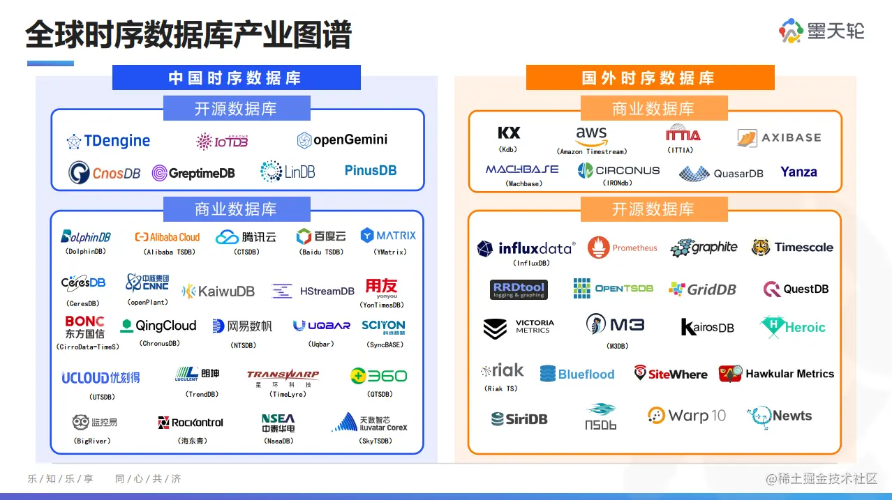 据墨天轮最新统计,截止2023年5月,全球时序数据库有54个。其中,墨天轮中国数据库流行度排名收录了36个时序数据库产品。本次报告整理发布**【全球时序数据库产业图谱】**,将之分为开源与商业数据库两类,并以中国和国外产品进行区分。以下为图谱截图,下载报告可查看高清版。