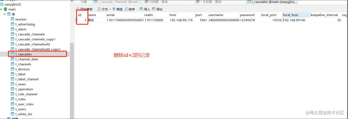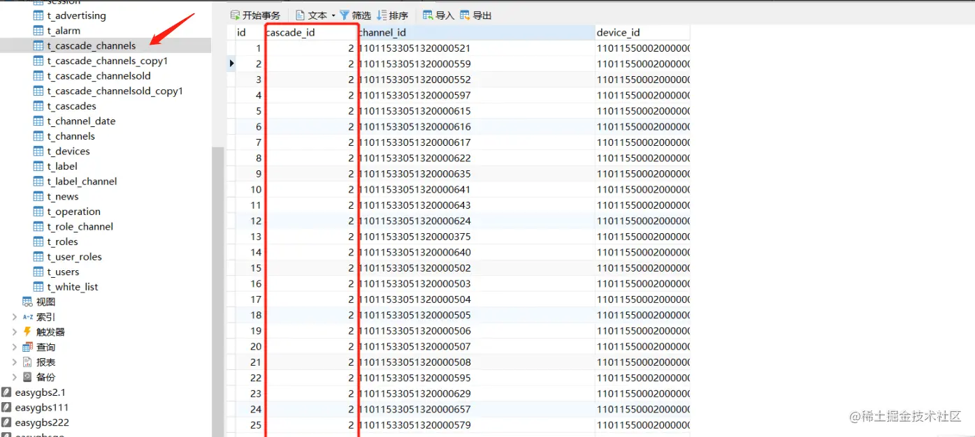 EasyGBS级联记录中添加关联的设备后,删除该条级联记录却并不会删除该条记录所关联的设备通道,导致数据库t_cascade_channels表产生大量的垃圾数据,影响数据操作效率,如图所示: