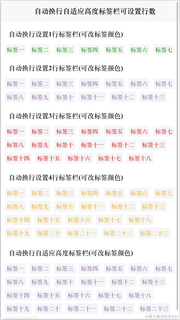 <view class="titleV">自动换行自适应高度标签栏(可改标签颜色)</view>