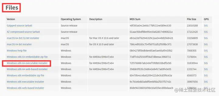 4. 进入python3.8.6的下载页面后,滑到下边Files,下载Windows x86-64 executable Installer