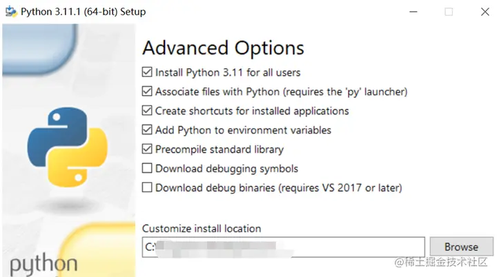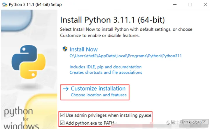 7. 勾选Use admin privileges when installing py.exe和Add python.exe to PATH,单击