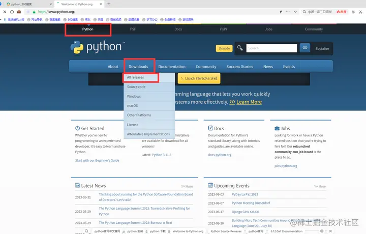 2. 在官网的Downloads栏目,选择对应的操作系统