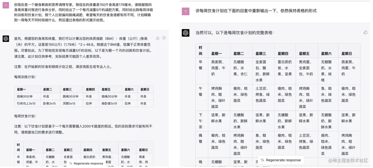 以减肥举例,初用者提问是:给我制定一个减肥计划,这种很难能得到自己想要的结果,按照上面公式进行提问: