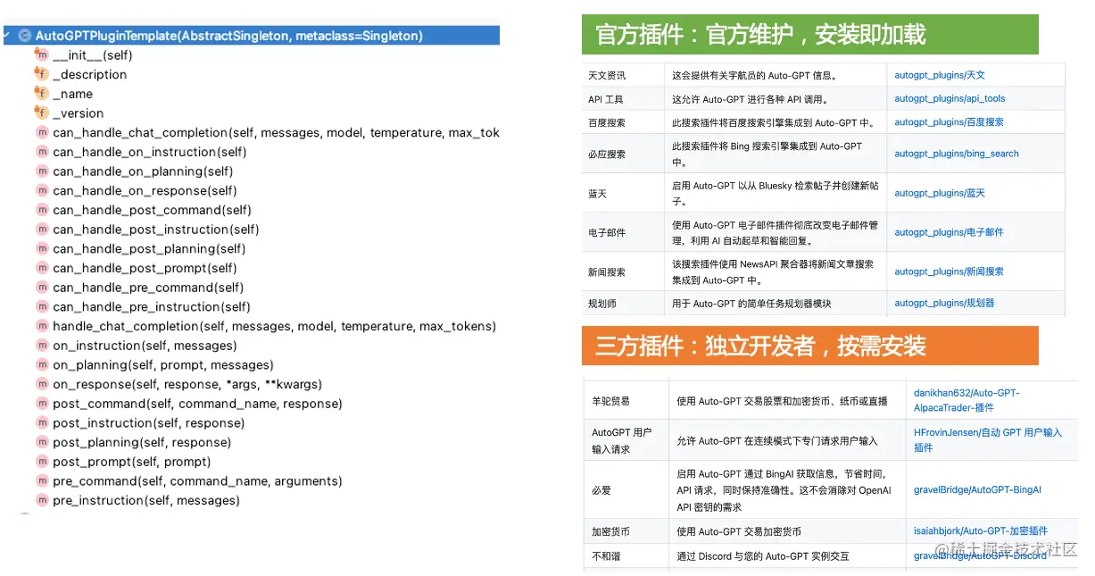AutoGPT支持插件机制,以提高扩展能力,如Bing搜索、新闻榜单等。